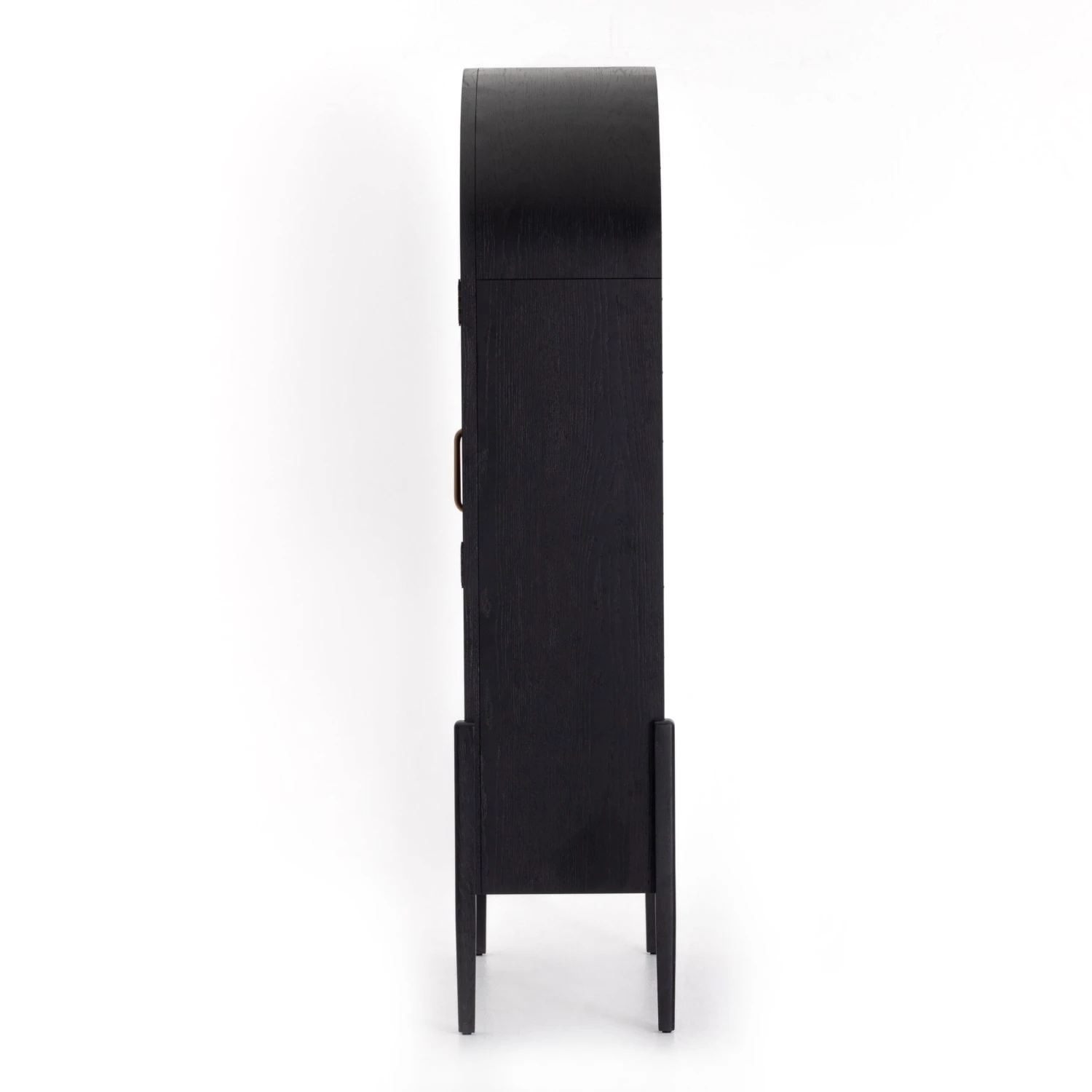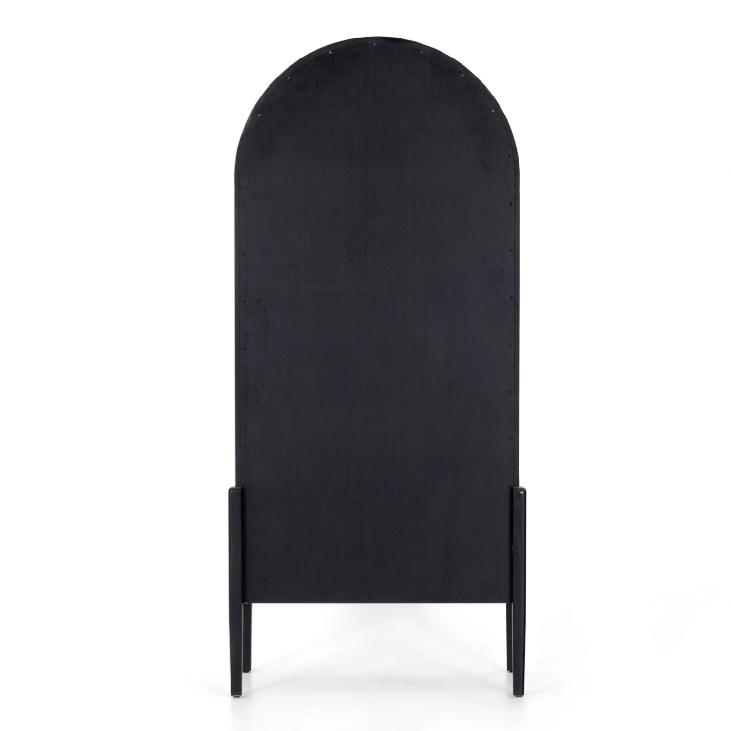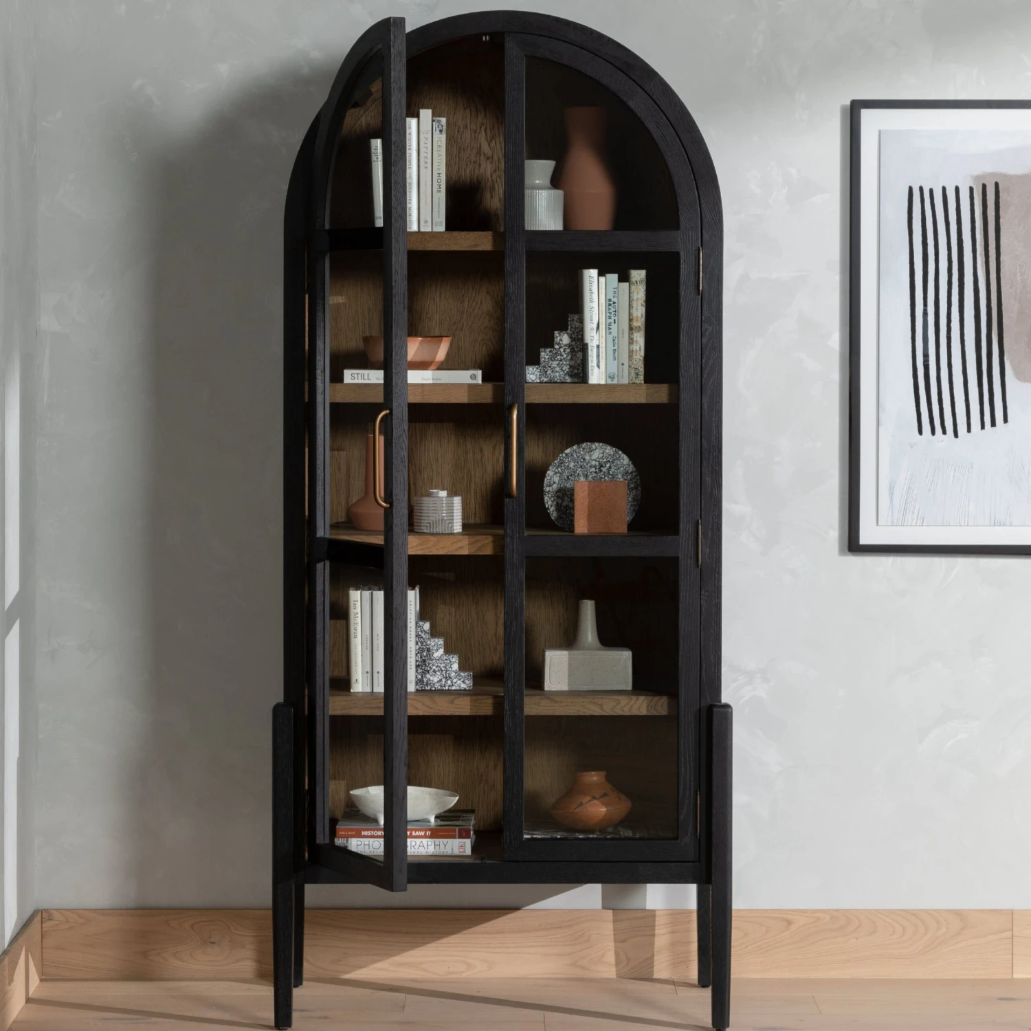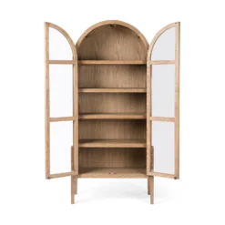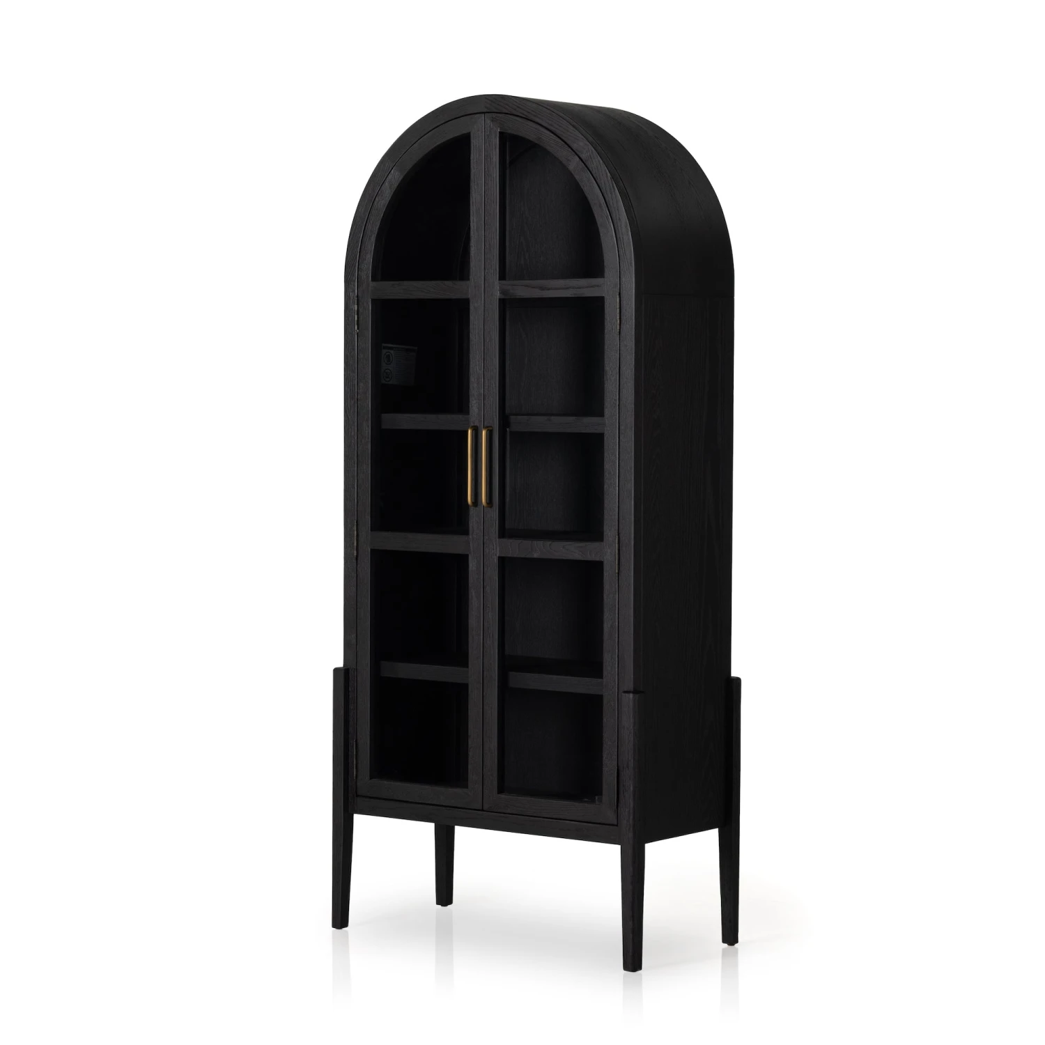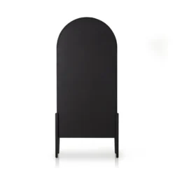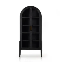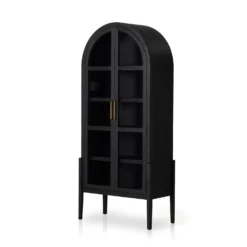 Made from black-finished solid oak, French-inspired cabinetry features an arched top, spacious interior and a clear glass front for storage and display.