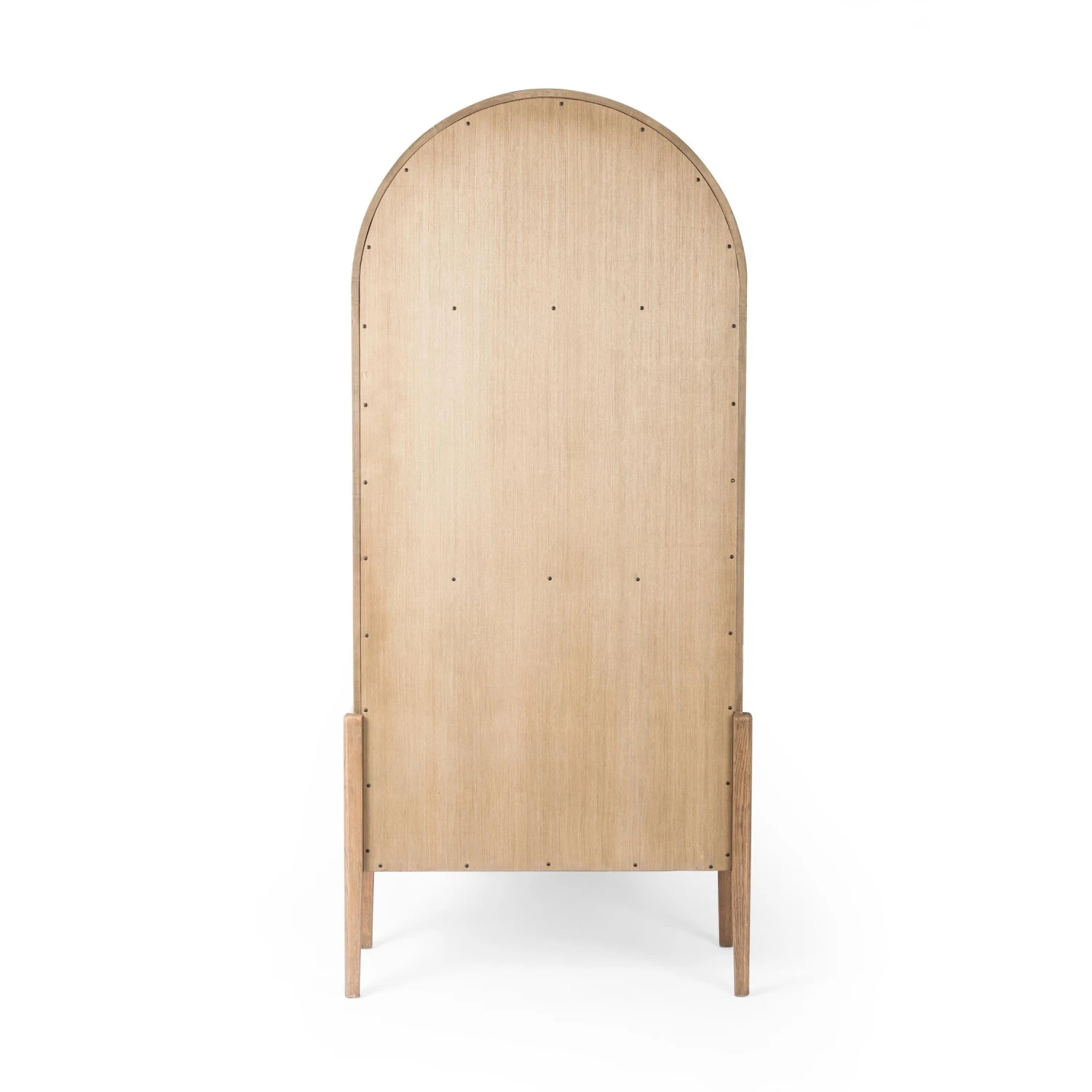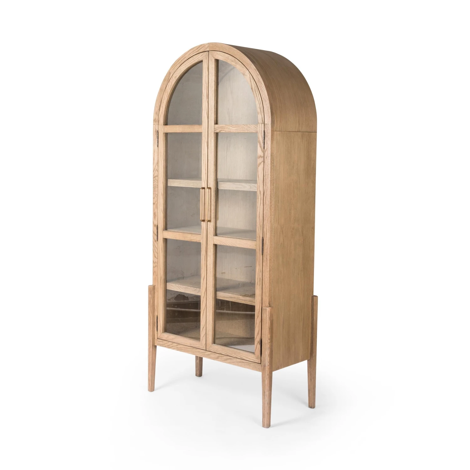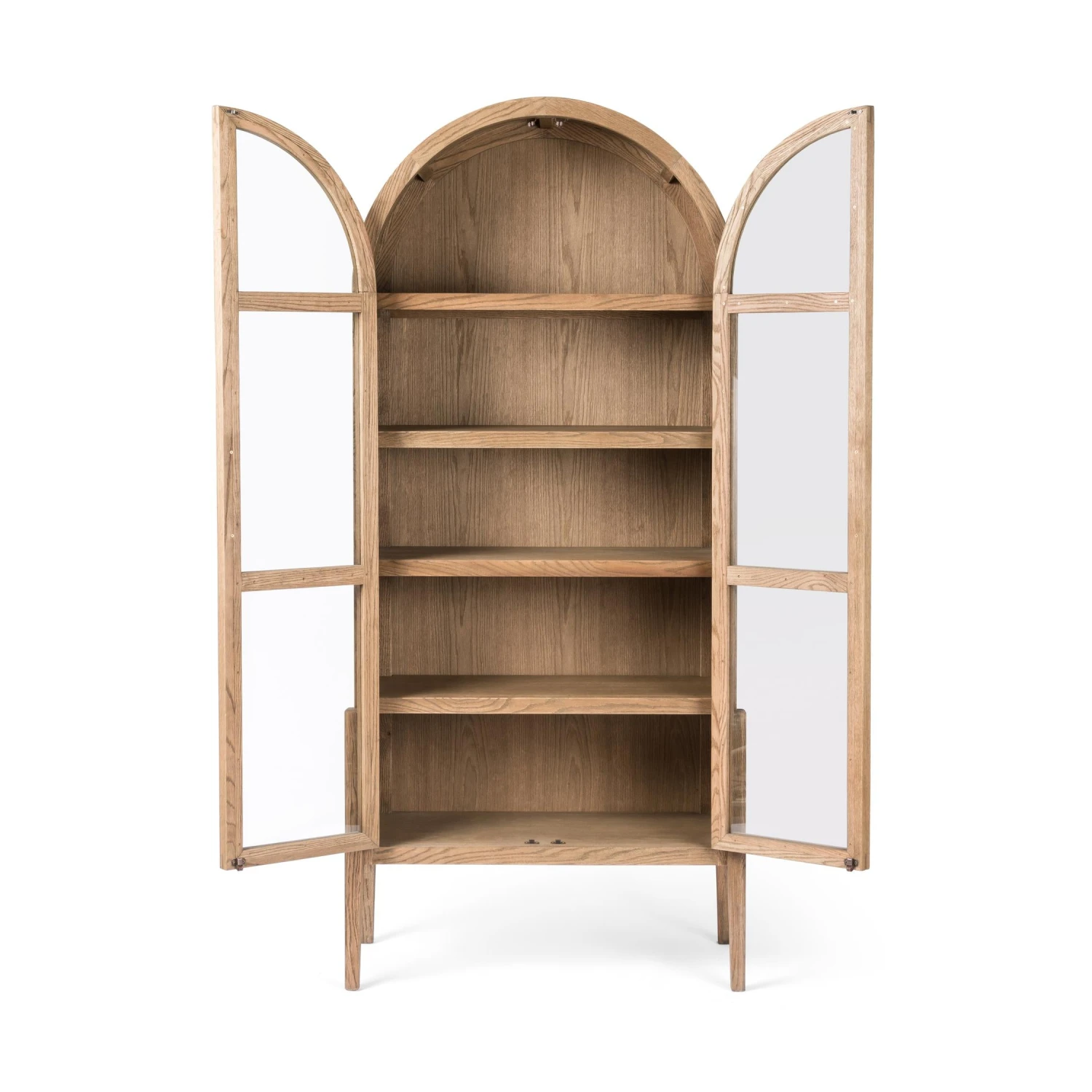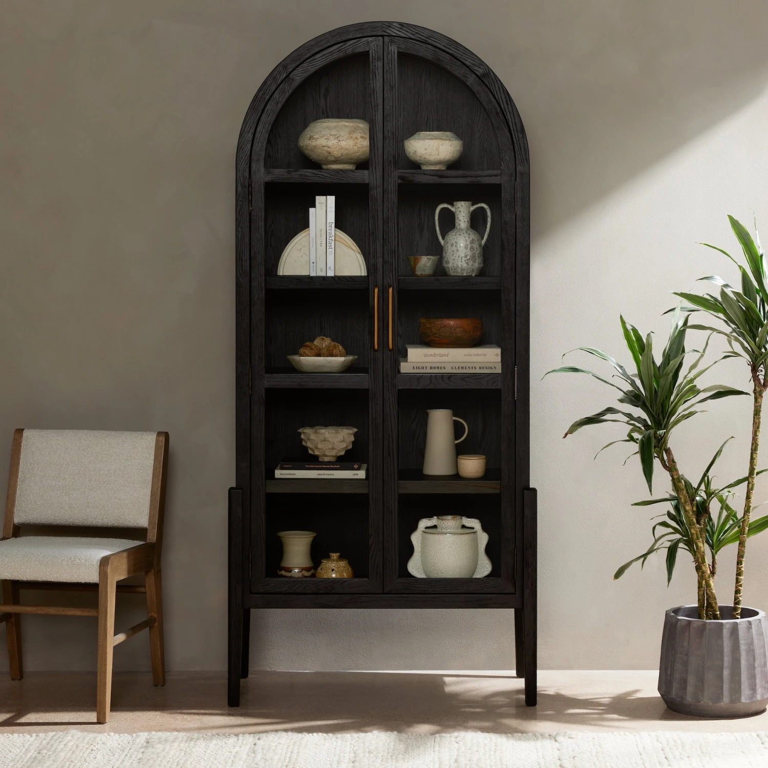 Made from black-finished solid oak, French-inspired cabinetry features an arched top, spacious interior and a clear glass front for storage and display.