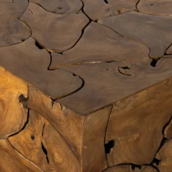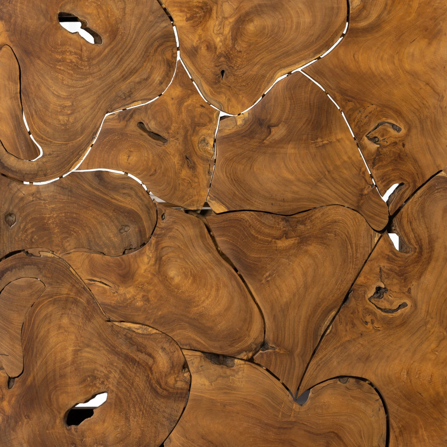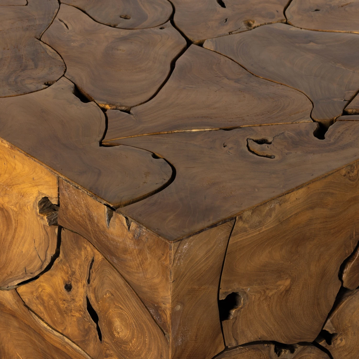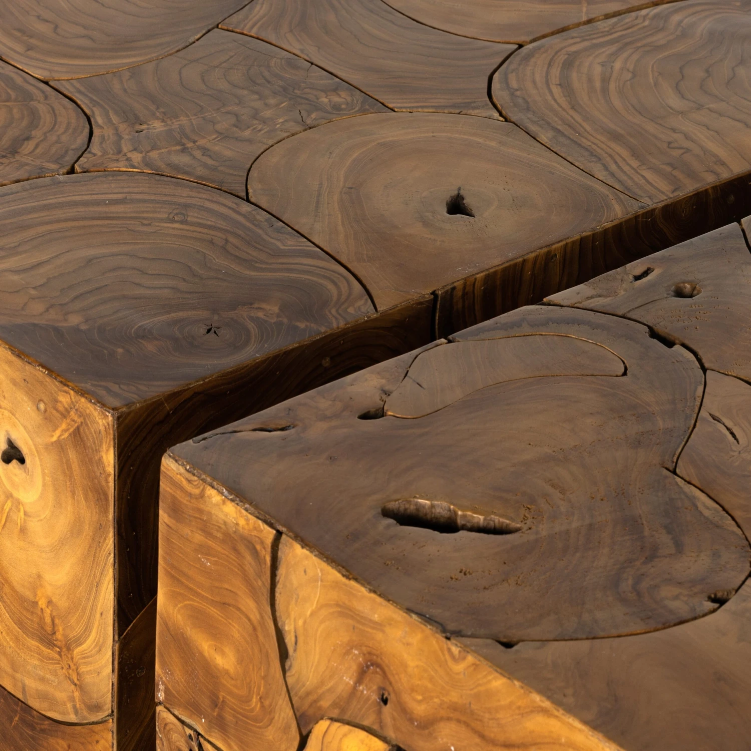 A unique pair, perfect for layering — indoors or out. Made from laminated teak root with miter joinery, these simply shaped bunching tables offer organic vibes and plenty of natural movement. Reflective or natural materials, tables will vary from piece to piece. Joint expansion may grow visible over time. Cover or store indoors during inclement weather and when not in use.