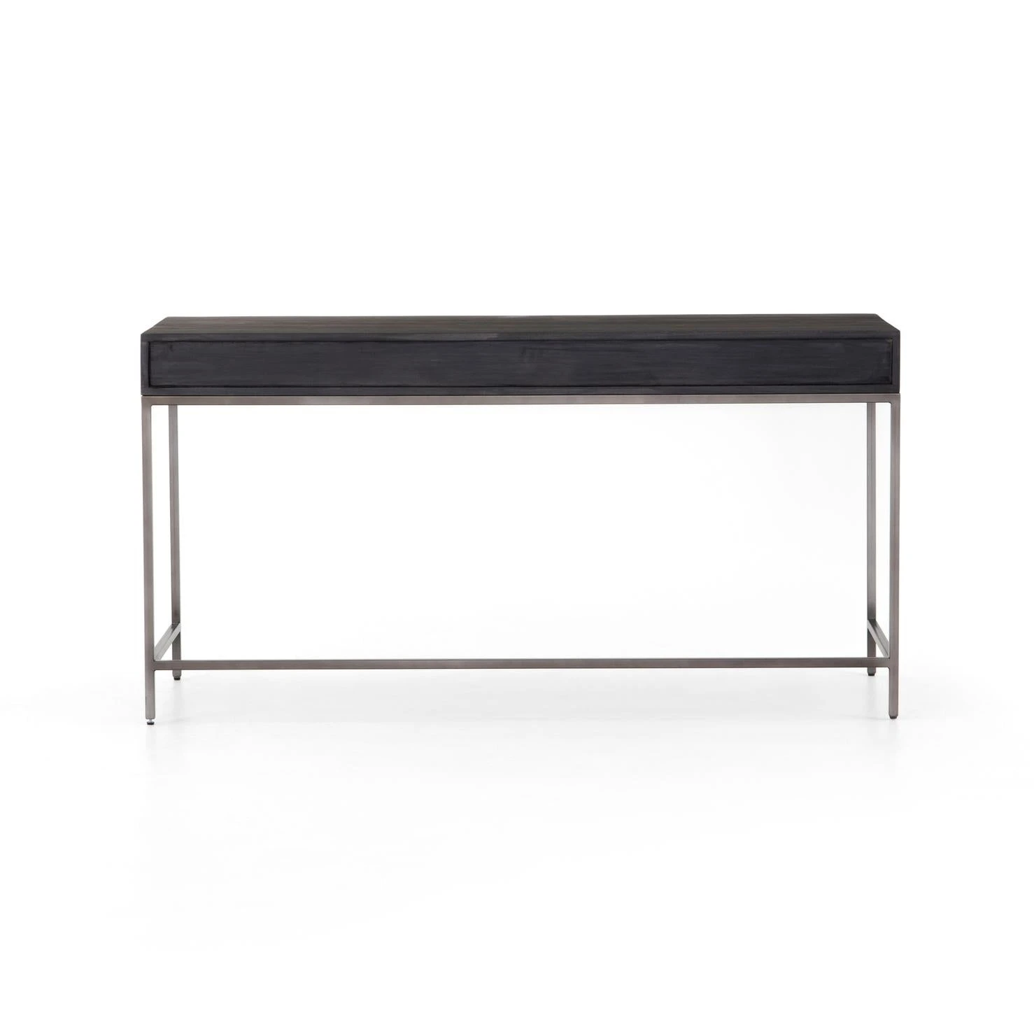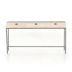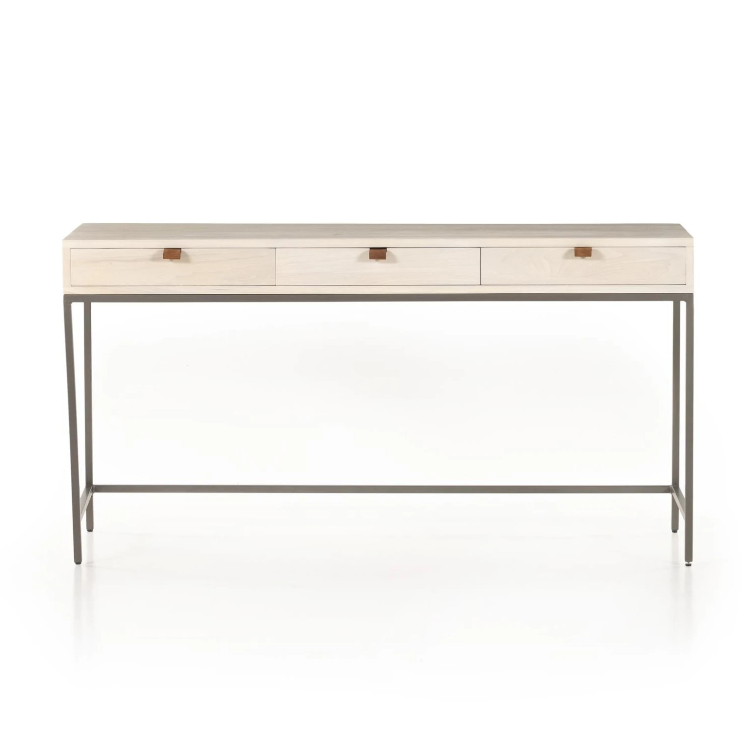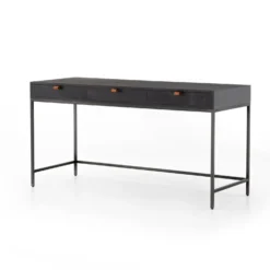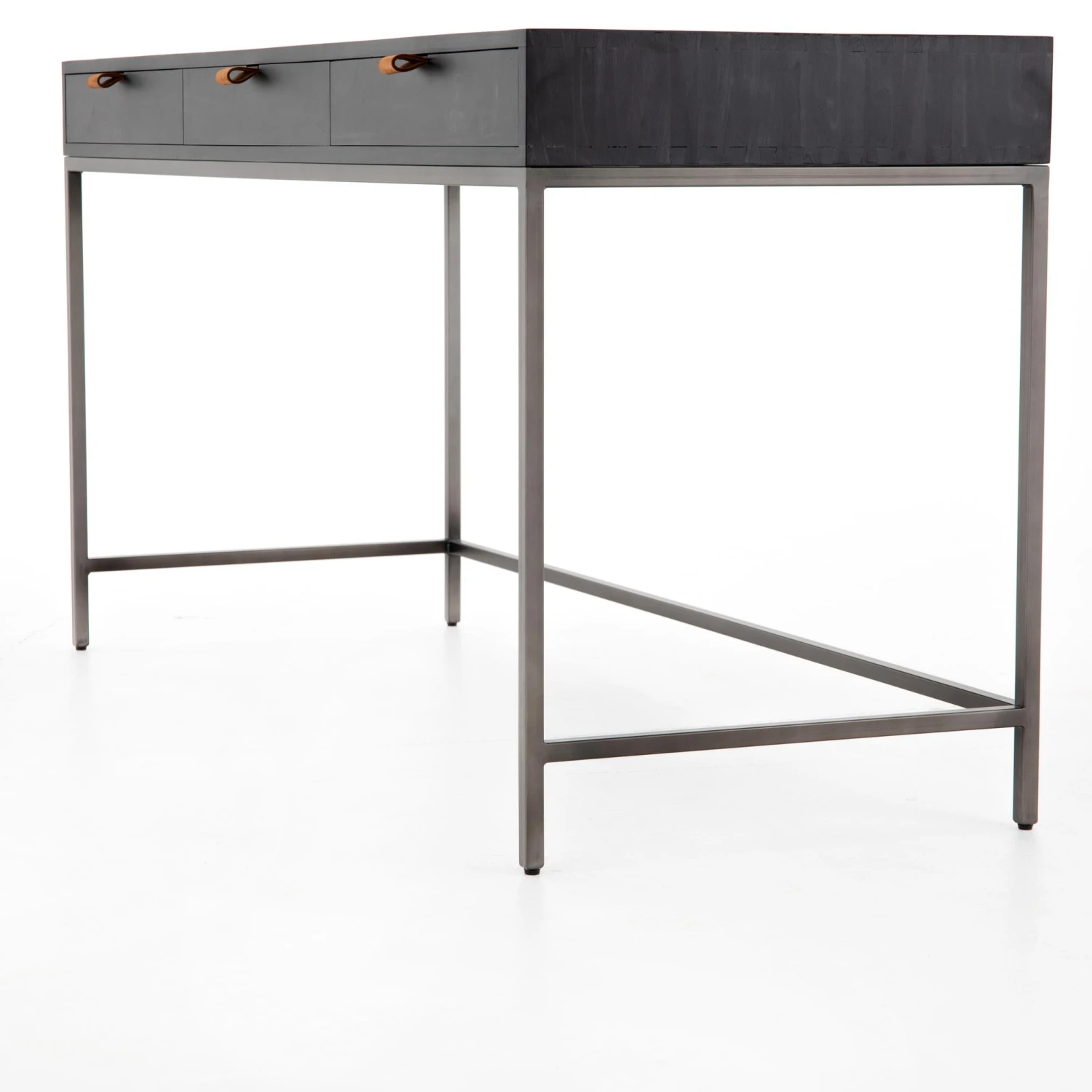Inspired by clean midcentury design, solid poplar and raw iron fuse for style and storage alike, offering three spacious drawers, with a fully finished back plus metal-secured leather pulls for an element of surprise. Great solo or paired with matching corner desk, file cabinet or credenza.
