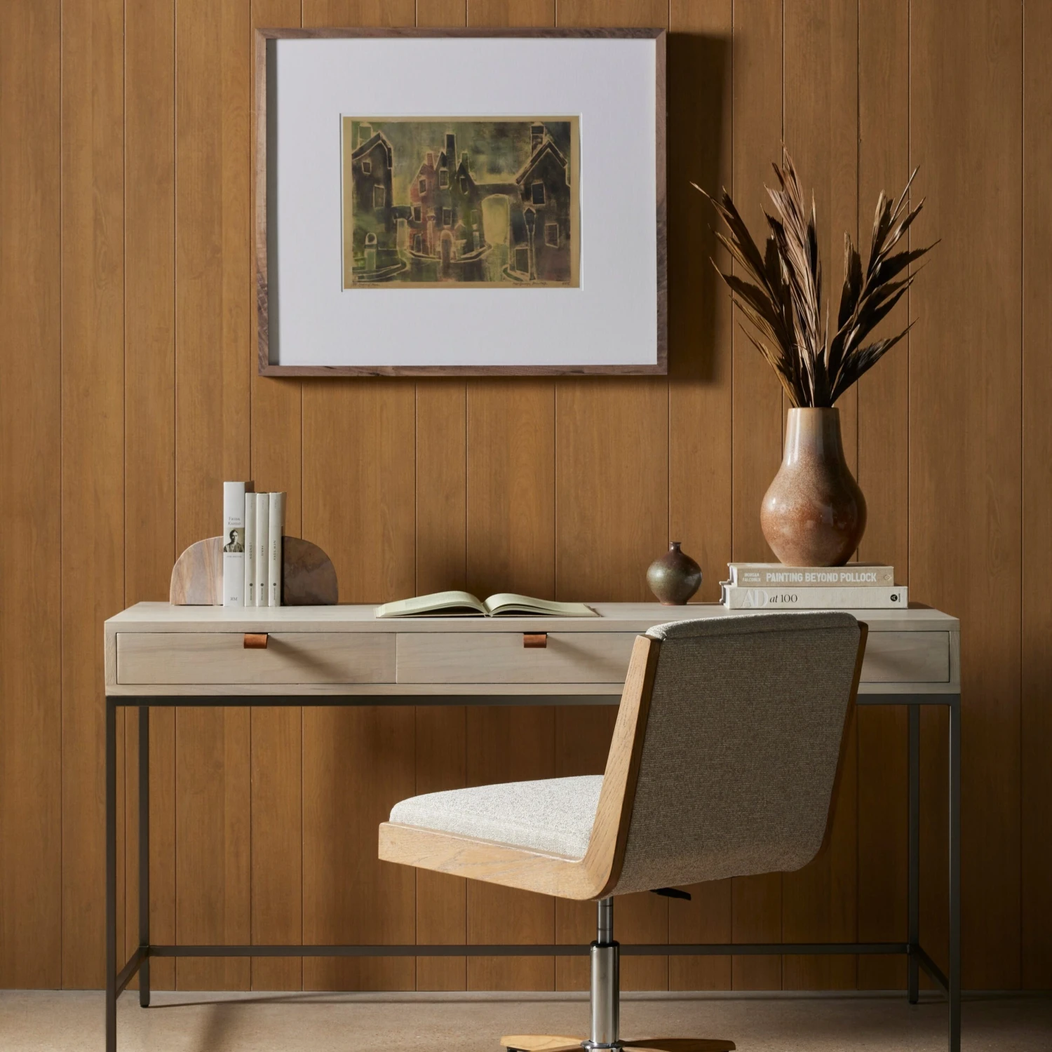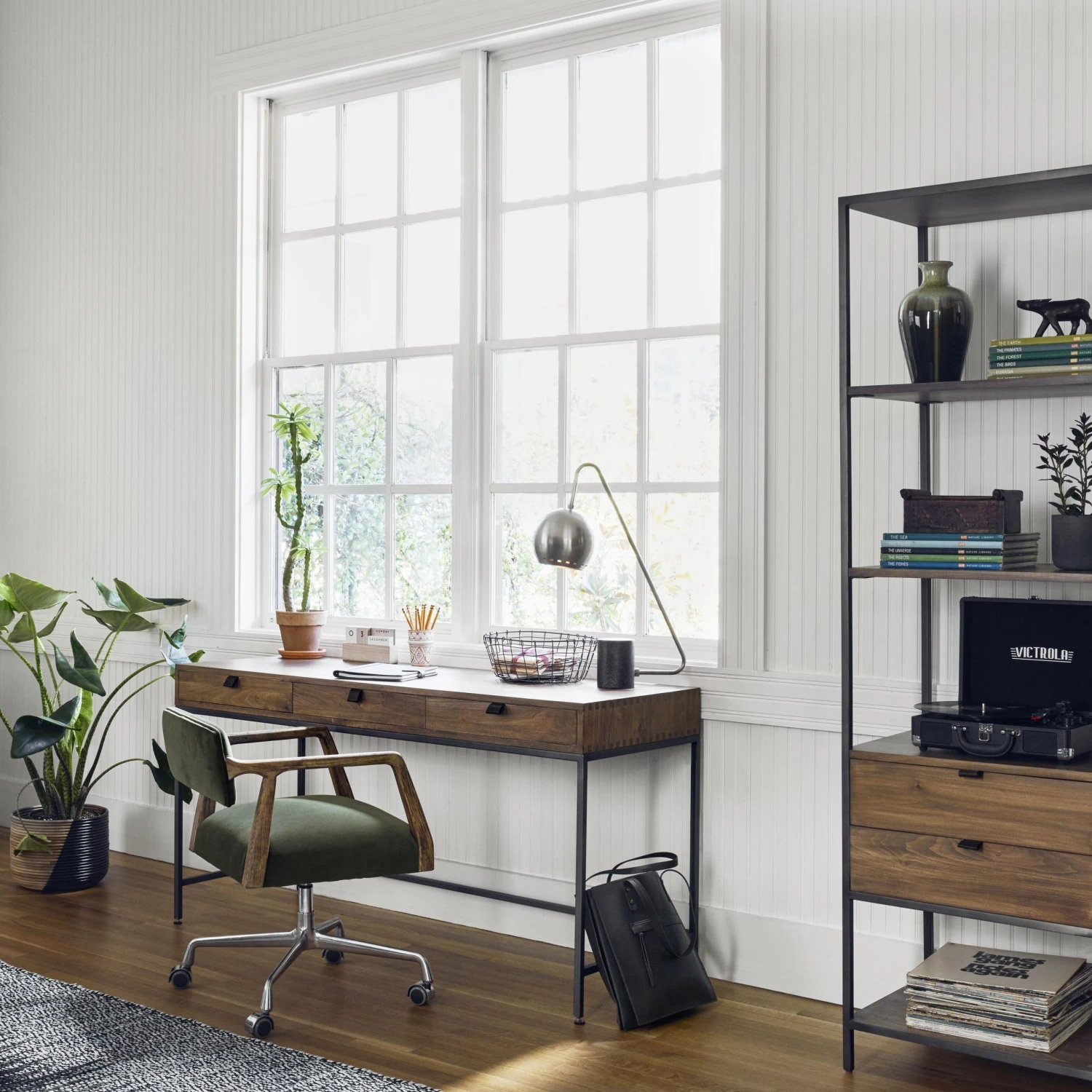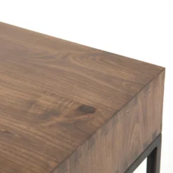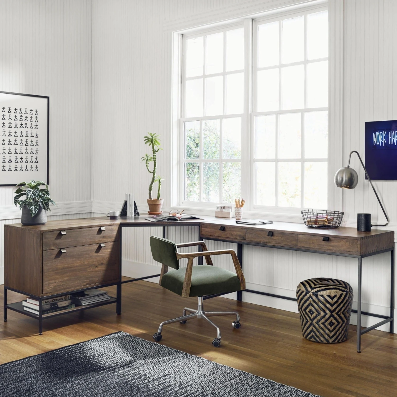 Inspired by clean midcentury design, solid poplar and raw iron fuse for style and storage alike, offering three spacious drawers, with a fully finished back plus metal-secured leather pulls for an element of surprise. Great solo or paired with matching corner desk, file cabinet or credenza.