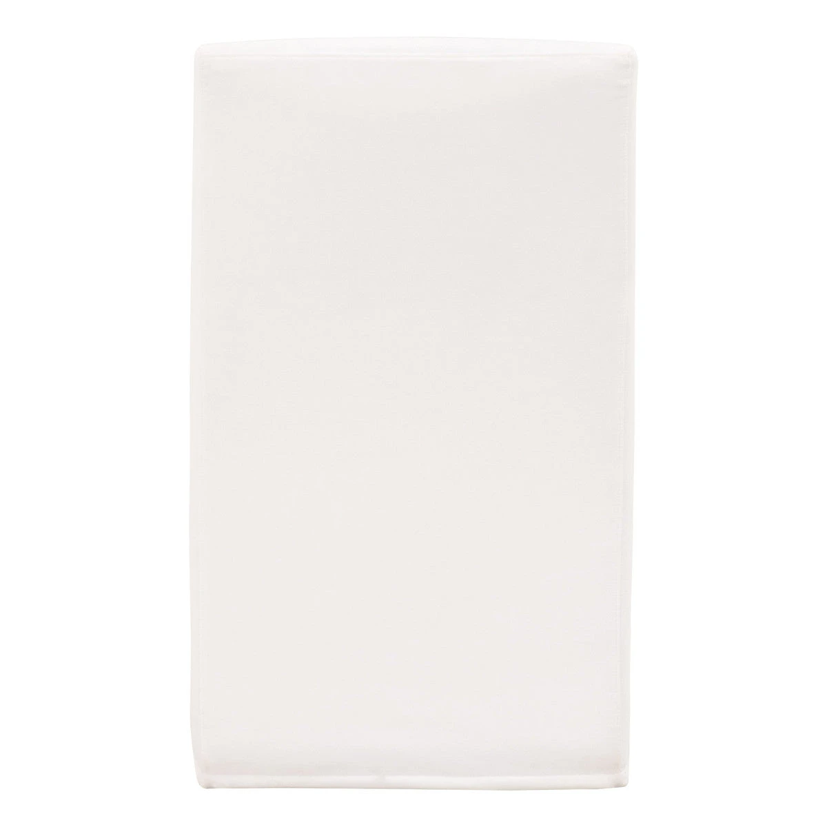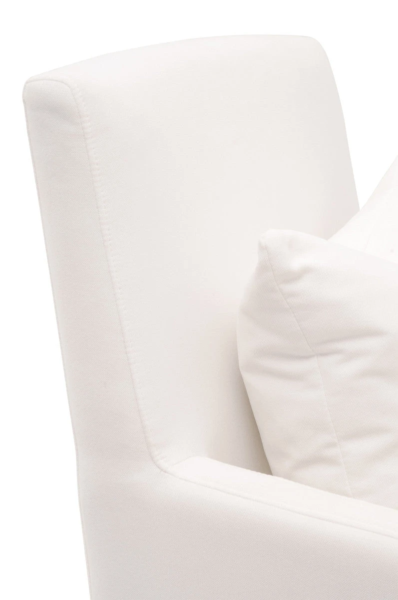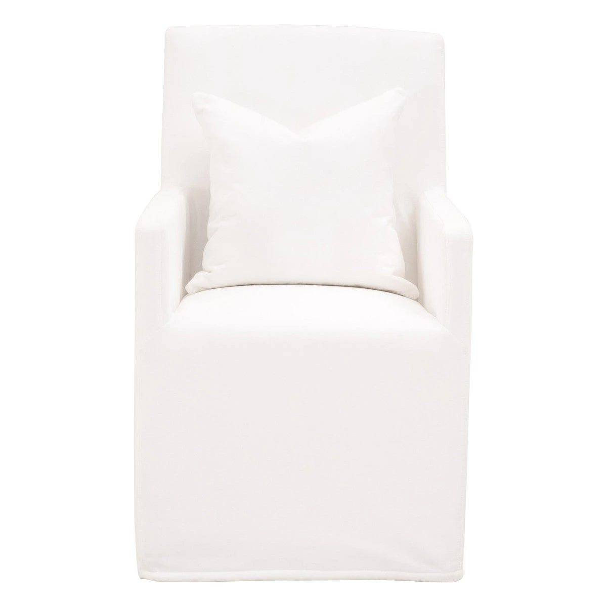 This classic slipcover arm chair has a very formal, yet relaxed look. A form-fitting slipcover fits the wood frame of this chair like a glove. It features a skirted bottom and arm rests at the perfect height for sliding under most tables. The slipcover is made of a high-performance material and is removable for convenient cleaning purposes. The chair also includes a down feather throw pillow for extra back support. Caster wheels are attached to the legs for easy movement and mobility. The light and neutral tones of the white material make this chair a great fit for many dining spaces. Furnish your space with this timeless dining arm chair.